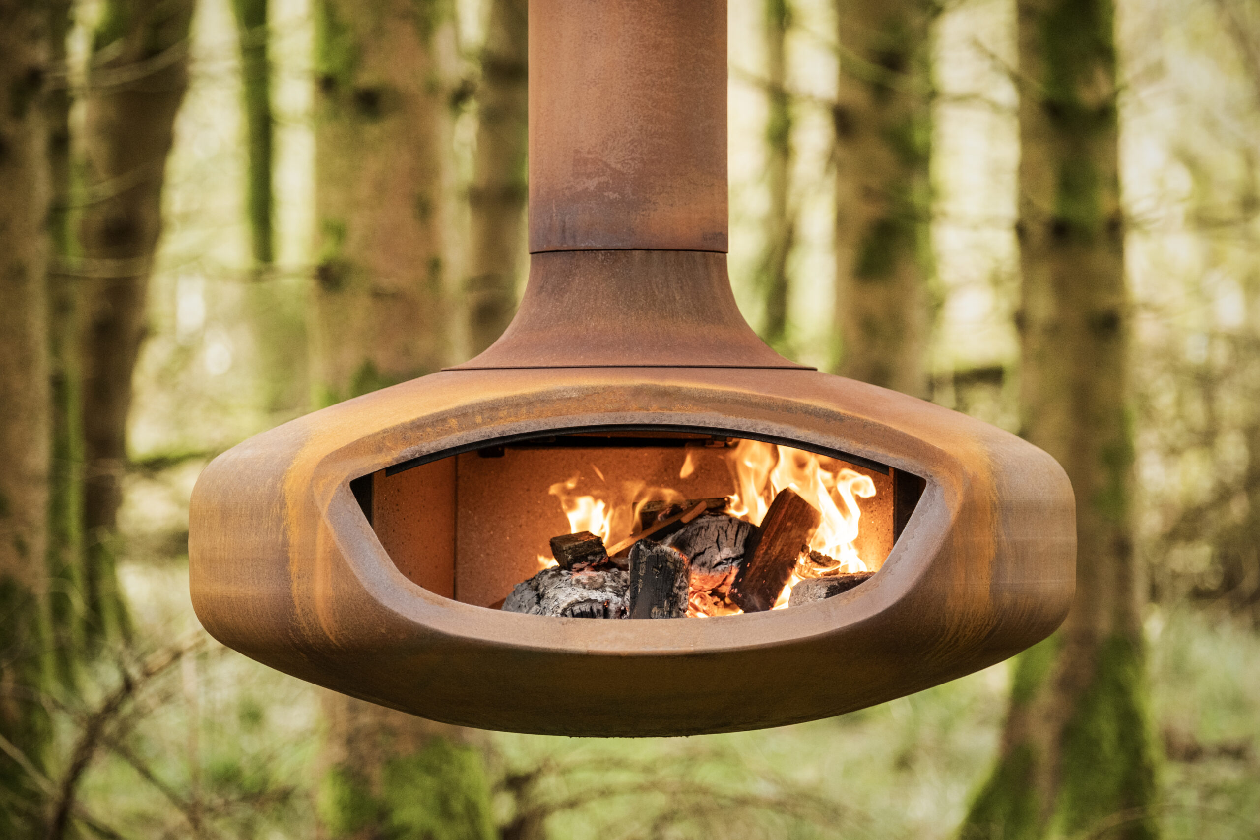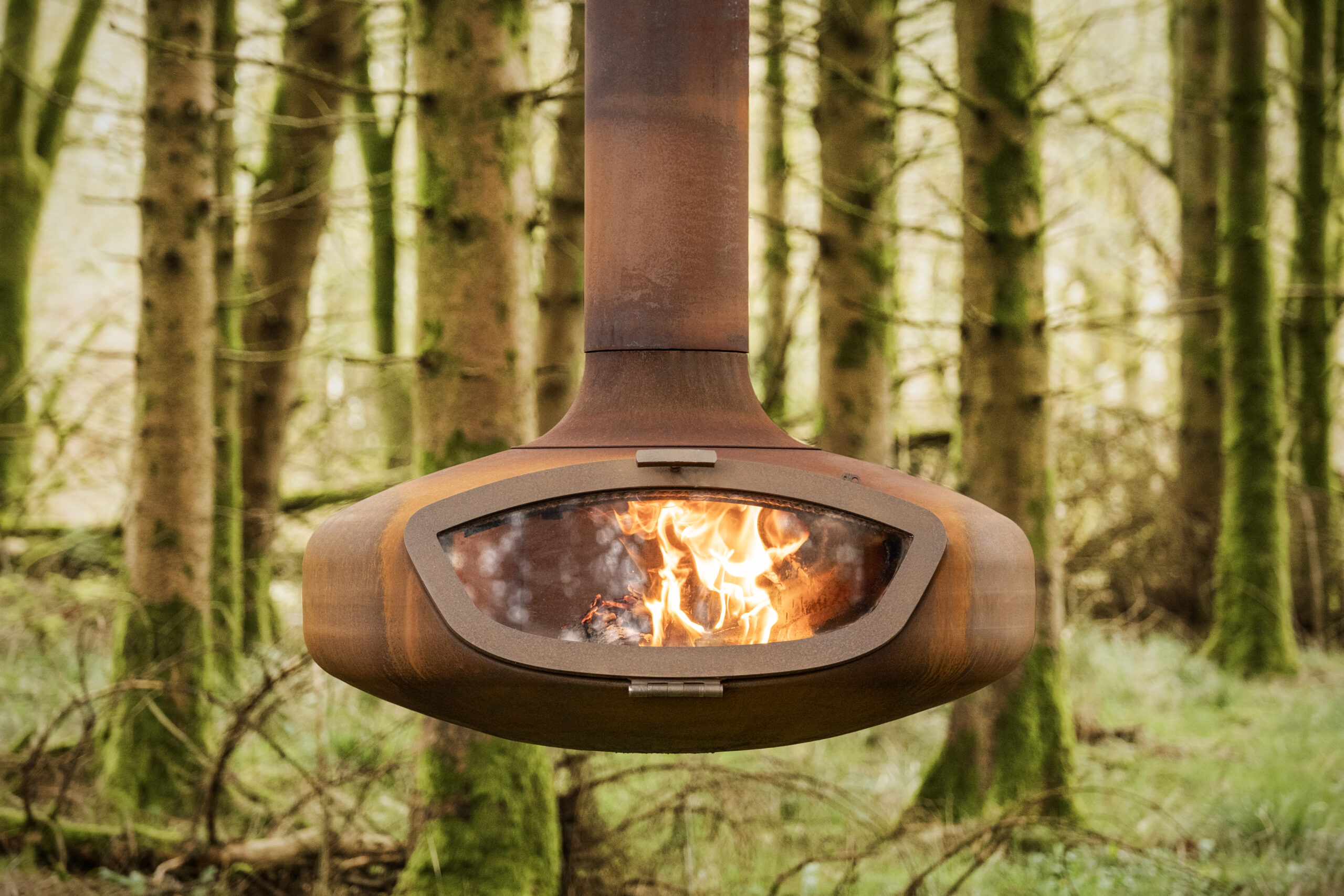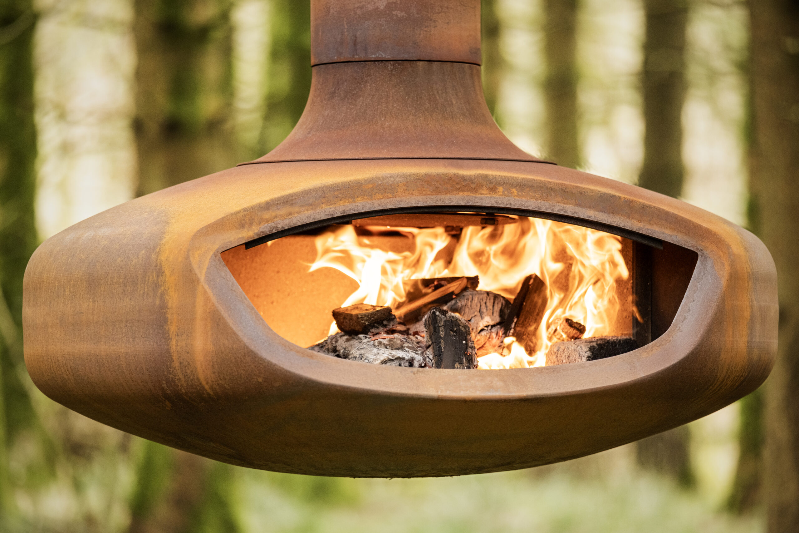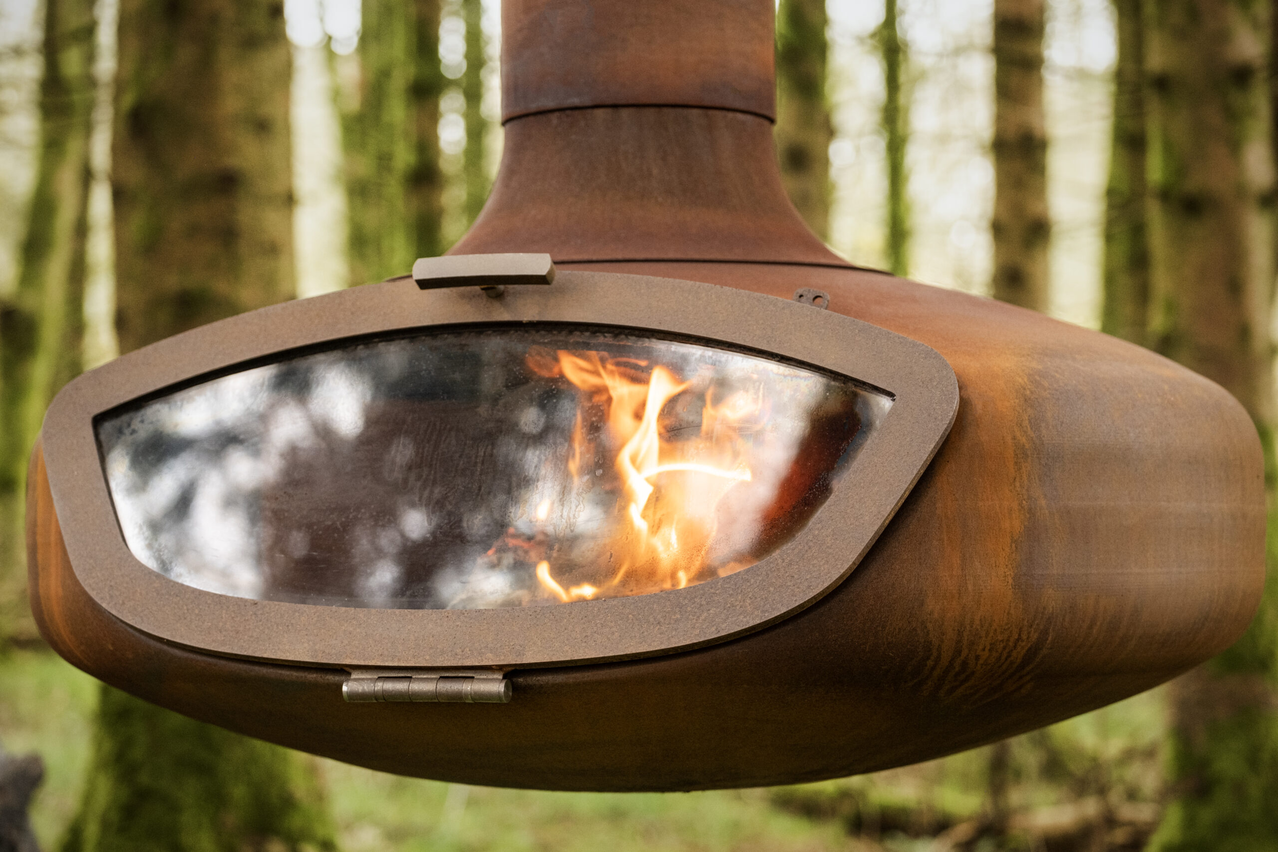 The FireBob Outdoor brings the same iconic, handcrafted quality of our beloved indoor wood burner to the open air — now forged in weathering steel for a living finish that deepens from warm bronze to a rich, rusty red over time. At 90cm in diameter, it makes a dramatic centrepiece whether suspended beneath a porch, veranda, or mounted on a bespoke fabricated frame — each installation finished with custom-length flue and made-to-measure fixing brackets. Available with or without a front door, the FireBob Outdoor adapts to your setting: we recommend the doored version where the fire is positioned above a combustible floor. Like everything we make at Firemaker, it is built in our Scottish Borders workshop to last a lifetime outdoors. They rotate too!